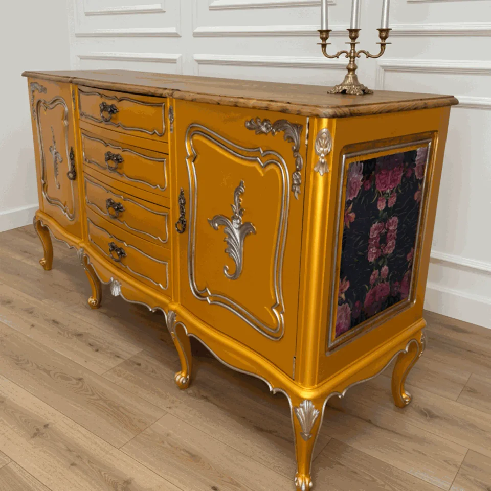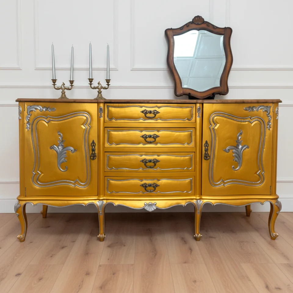 O Aparador Herança Dourada destaca-se pelo dourado intenso, pelos relevos clássicos e pelas curvas elegantes. Uma peça imponente e sofisticada, perfeita para trazer brilho e presença ao ambiente.