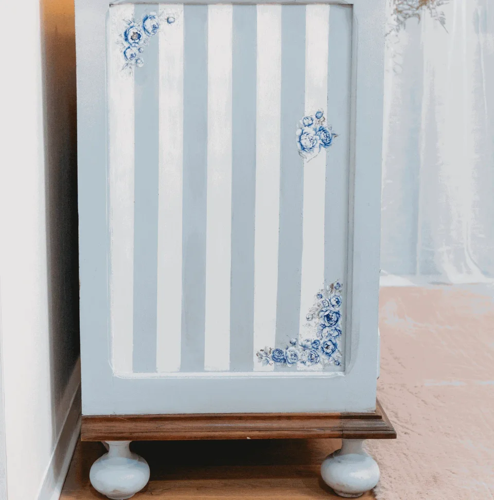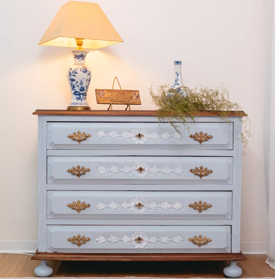 Os detalhes dourados revitalizados realçam o estilo vintage da peça, e os entalhes florais em branco acrescentam poesia e sofisticação às gavetas, a lateral apresenta listras verticais em tons suaves de azul e branco, que alongam visualmente o móvel e trazem um ar fresco muito charmoso, com aplicações florais em azul lembrando porcelana antiga.