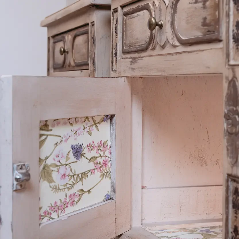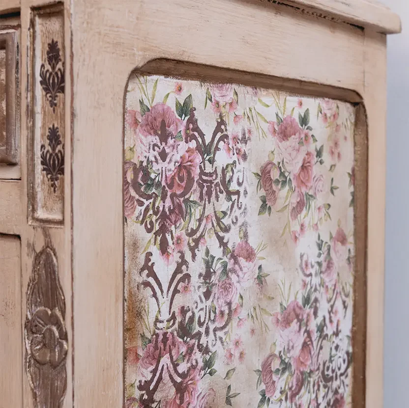 Os painéis laterais e interiores receberam aplicação de padrões florais vintage, criando pequenos jardins secretos que se revelam ao abrir as portas. Os detalhes dourados reforçam o toque poético e romântico da peça, tornando-a perfeita para quartos acolhedores, recantos de leitura ou espaços inspirados no estilo francês campestre.